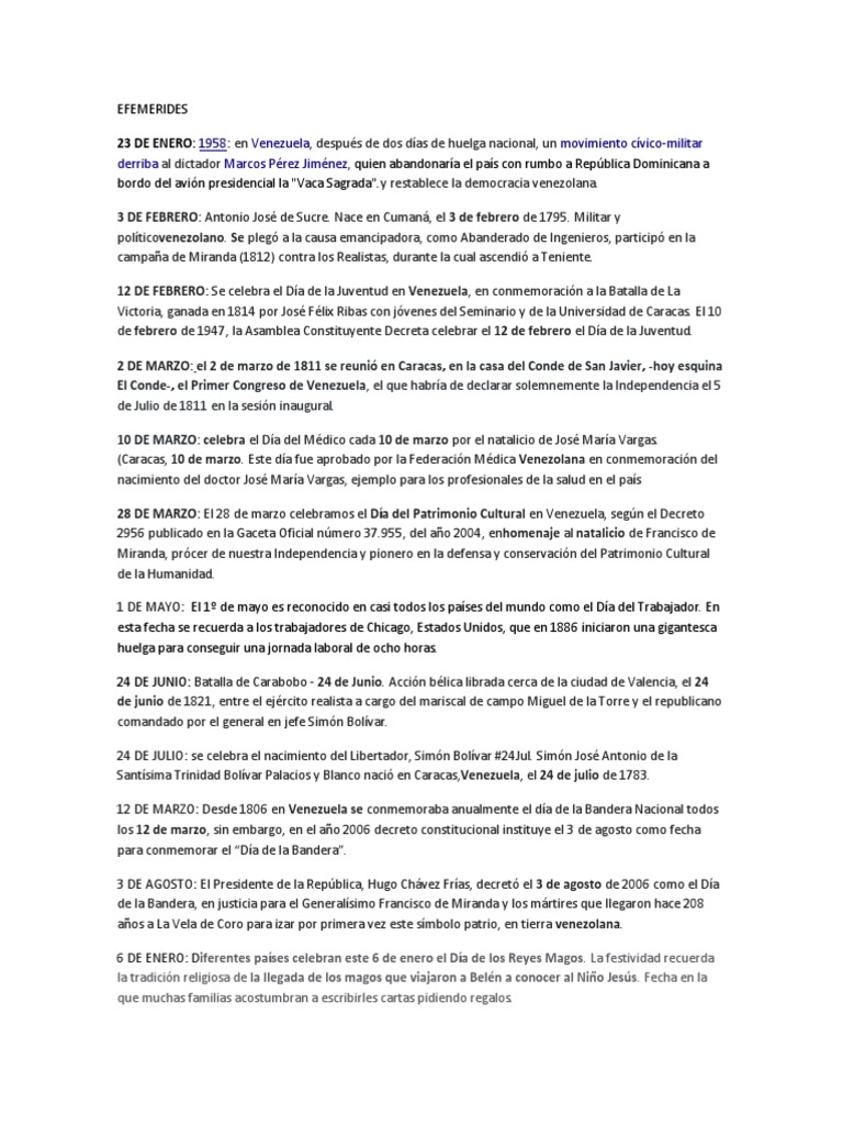 Efe Me Rides Carnaval Venezuela from imgv2-2-f.scribdassets.com Día del campesino se celebra todos los 24 de junio de cada año. El día de san juan se celebra en españa cada año el 24 de junio donde la noche anterior se reúnen amigos y familiares cerca de las hogueras. Hoy 24 de junio, a 200 años de la batalla de carabobo, el llamado a los venezolanos es a salvar a nuestro país y volver a carabobo, a la democracia, libertad y soberanía. 4 de junio, 01:42 gmt. En paralelo, en caracas tiene lugar la cumbre de jefes de estado y de gobierno de la alianza bolivariana (alba), que también rinde. El 24 de junio de 1821, se selló la independencia de venezuela, en la que se enfrentaron el ejército patriota comandado por simón bolívar y el ejército realista, a la cabeza de miguel de la torre. En honor a los patriotas que dieron su vida el 24 de junio de 1821, en la gesta heroica de la batalla de carabobo, venezuela conmemora el día del ejército bolivariano, celebración instaurada por decreto en 1958, a raíz de la caída de la dictadura. El 24 de junio es una fecha en la que se recuerdan numerosos acontecimientos mundiales y locales.